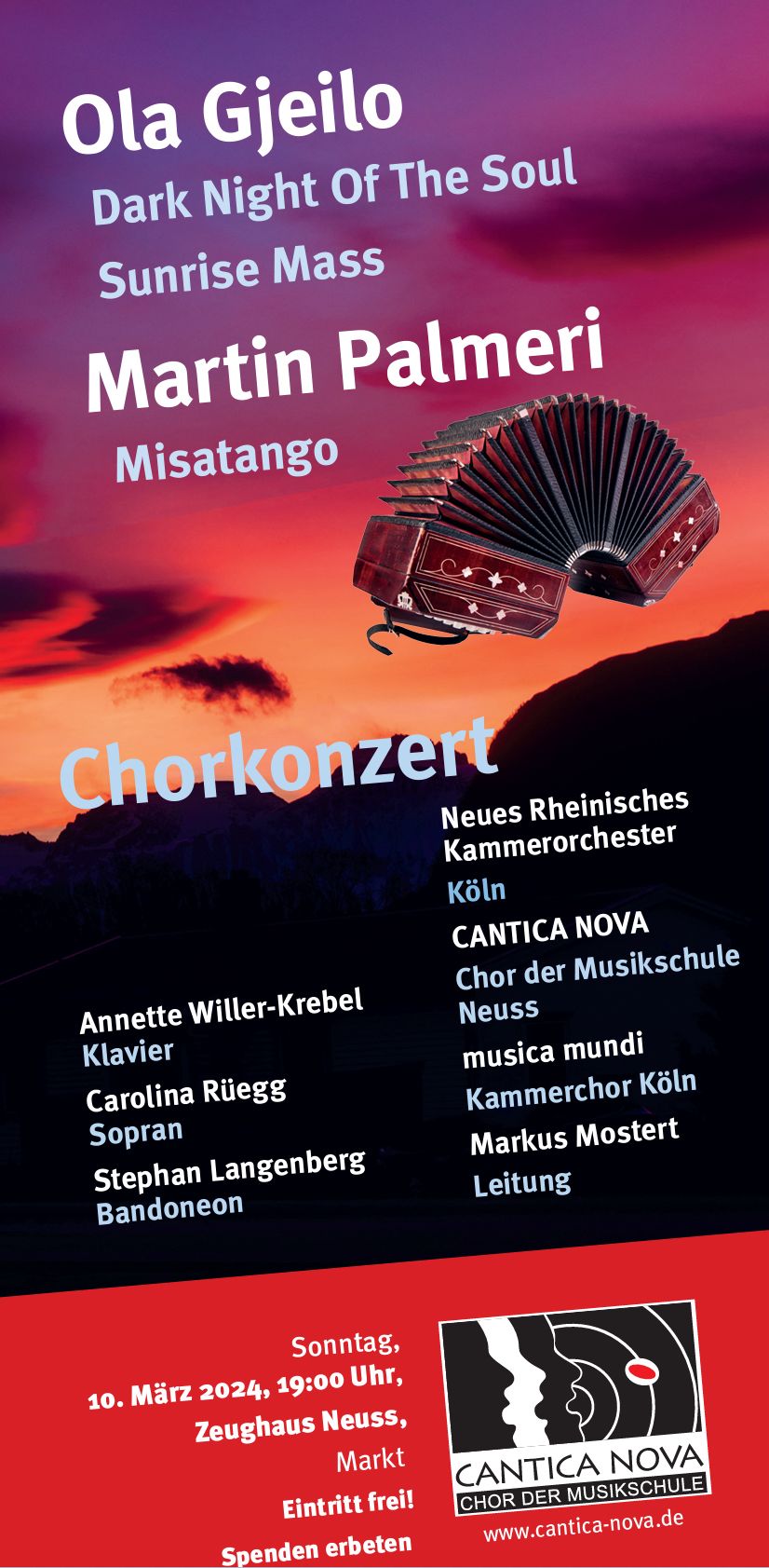 – - 19:00UhrDie Misa Tango von Palmeri lohnt sich zu hören. Die Musik ist sehr rhythmisch und mitreissend.